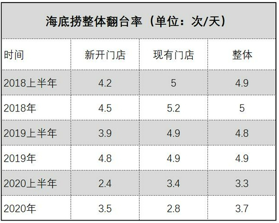 但近年来,海底捞的翻台率却出现连续下滑。相关财报数据显示,2019年,海底捞的平均翻台率下降到4.8次,为近三年来最低。2020年上半年,海底捞餐厅平均翻台率再次减少到3.3次。