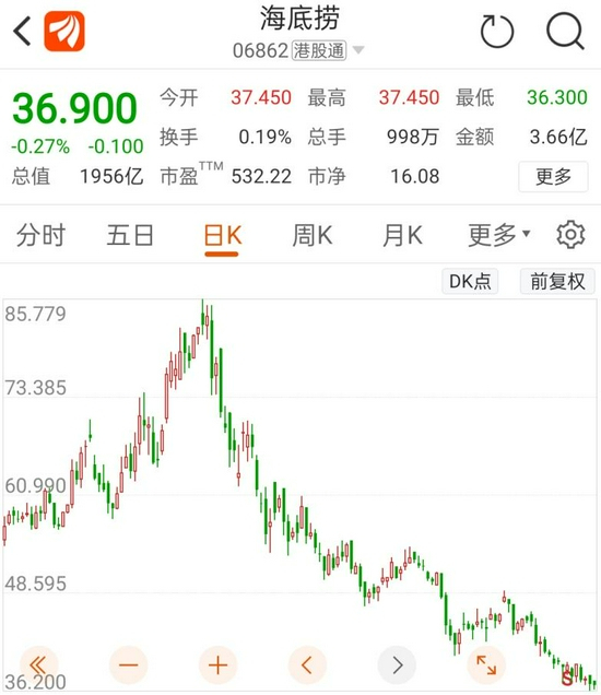 然而好景不长,自2月18日以来,海底捞的股价上演雪崩式下跌,此后股价一路下行,期间因股价暴跌屡屡冲上微博热搜。6月23日盘中,再度创下这一轮大跌的新低36.2港元,相比最高价的累计跌幅达57.8%,已经腰斩。