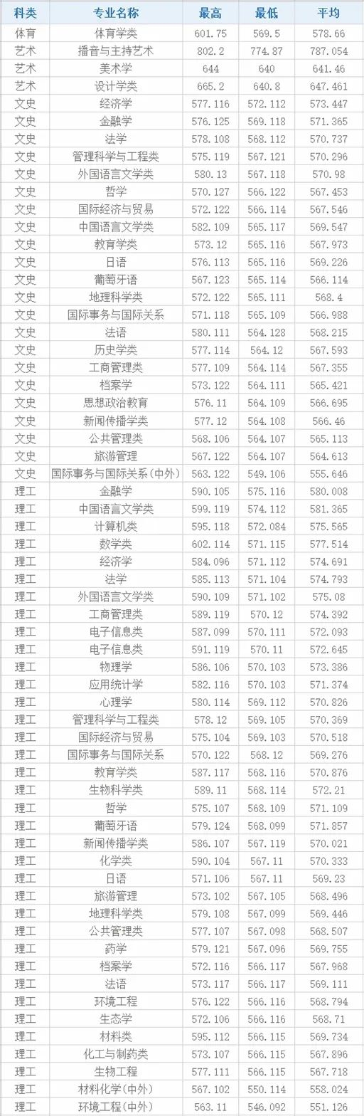 按照投档成绩(综合成绩)统计各批次、各科类、各专业(类)的最高分、最低分、平均分。其中美术学类综合成绩计算办法:[(高考文化成绩+优录加分)×40%+专业统考成绩×60%]×2+专业统考成绩×10-6;播音与主持艺术综合成绩计算办法:高考文化成绩+优录加分)+专业统考成绩+专业统考成绩×10-6;体育类综合成绩计算办法:[(文化总分+优录加分)×50%+体育身体素质测试成绩×75%]+体育身体素质测试成绩×10-6。