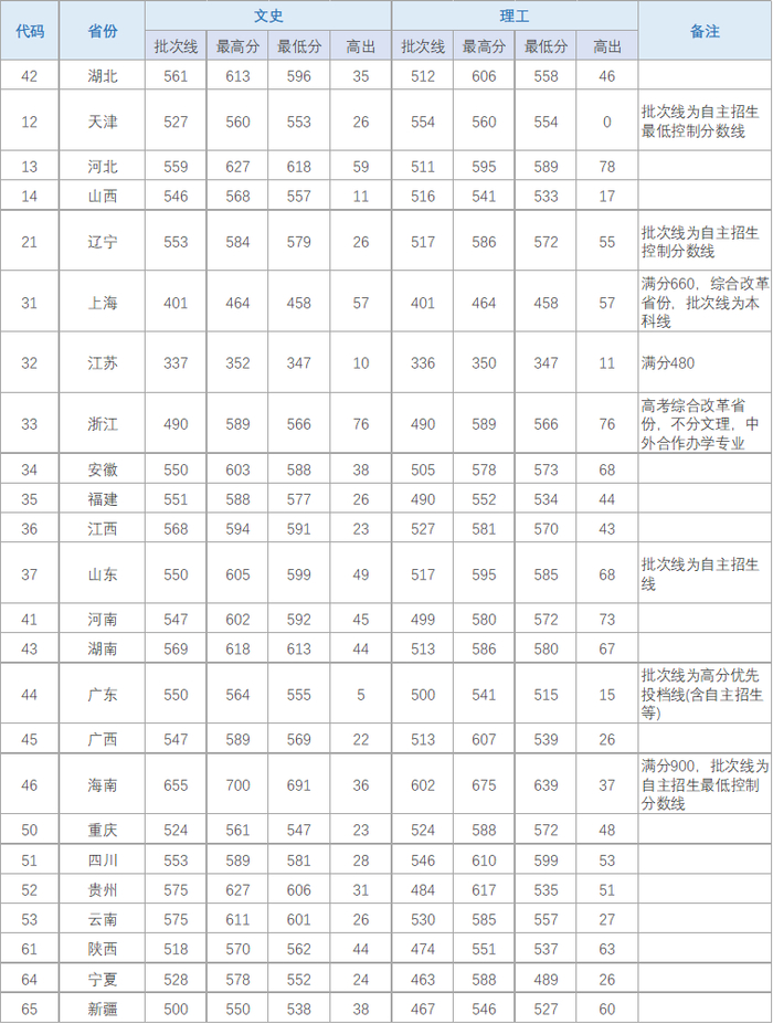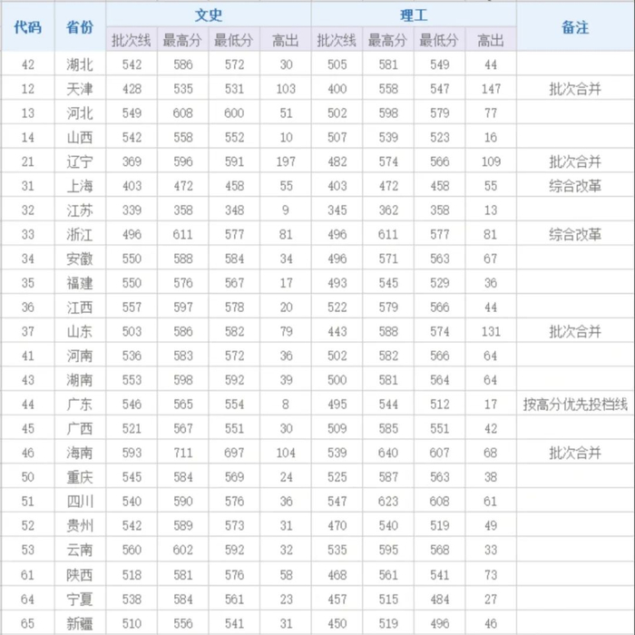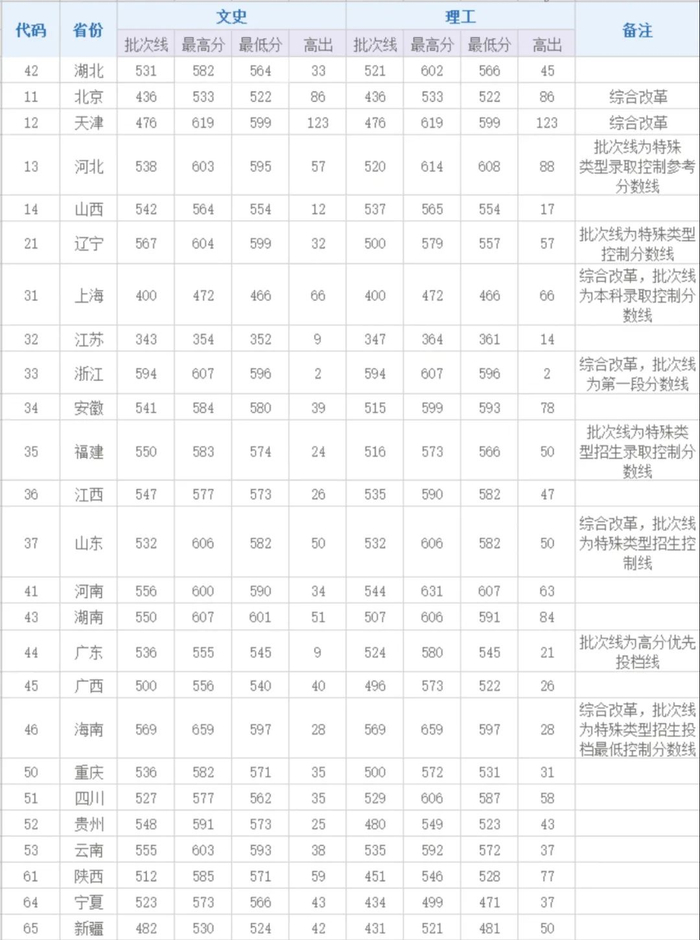 各省市录取分数统计表