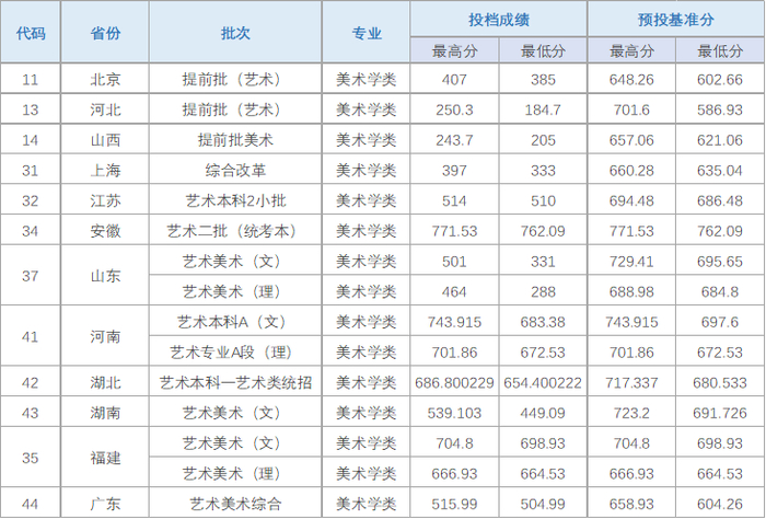 各省美术类(美术学、设计学类)录取分数统计