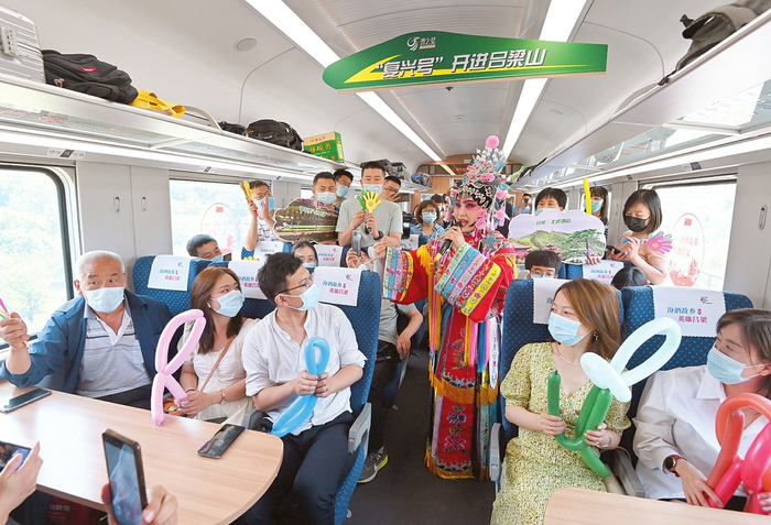 6月26日,太原南至吕梁站间“复兴号”动车组列车正式开通。当日,列车上文艺小分队的队员们载歌载舞,向旅客献上精彩的文艺节目。(史晓波摄