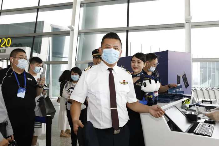 记者在现场看到,在天府机场T2航站楼的登机口,在优雅的弦乐四重奏的烘托之下,东航意大利籍飞行员迭戈为首航旅客发放“首航纪念登机牌”,用四川话“巴适”点赞天府新机场;功勋飞行员、共和国同龄人、东航五星机长谢远征与首航旅客一起首航,他激动表示:“短短几十年,我们民航从一穷二白到如今的世界一流水准……我们这一代民航人、这一代飞行员感觉圆梦了。”