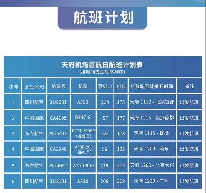 国航在天府国际机场首航航班是CA4195,上午11:40分从天府机场飞往北京首都机场。中午12点左右,国航CA1948航班将从天府机场飞往上海浦东机场。