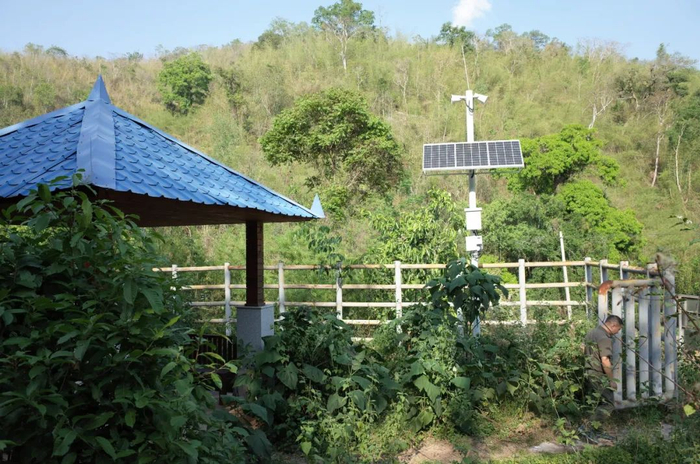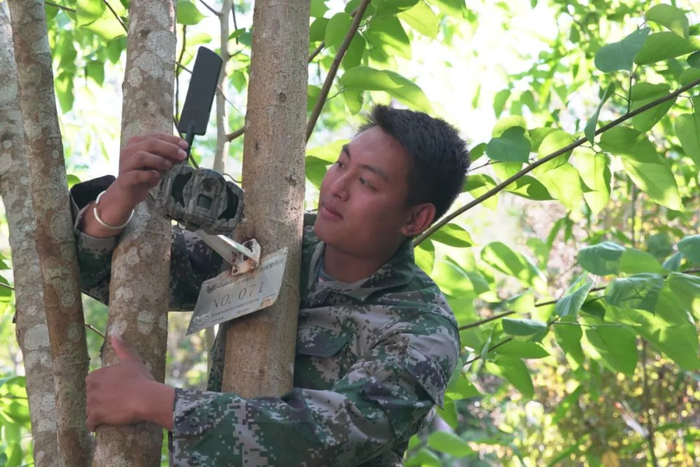 巡护员检查布设在保护区象道旁的红外预警监测相机。