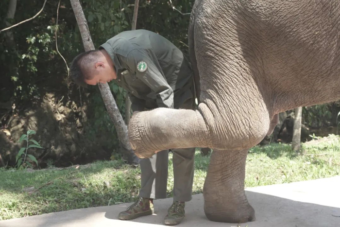 “象爸爸”为救助的亚洲象检查脚掌。