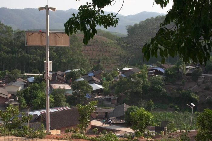 竖立在景洪市倒淌箐村村口的防象预警广播塔。
