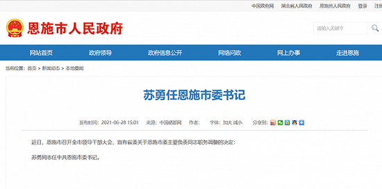 据湖北恩施市政府网6月28日消息,近日,恩施市召开全市领导干部大会,宣布省委关于恩施市委主要负责同志职务调整的决定:苏勇同志任中共恩施市委书记。