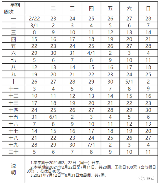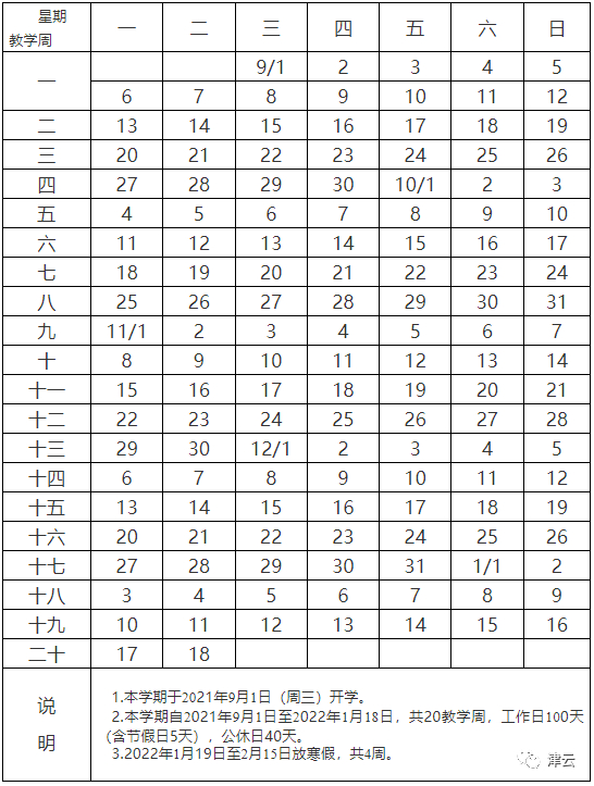 依据中小学2021~2022学年度第一学期教学行政历,2021~2022学年度第一学期于2021年9月1日(周三)开学,自2021年9月1日至2022年1月18日,共20教学周,工作日100天(含节假日5天),公休日40天。