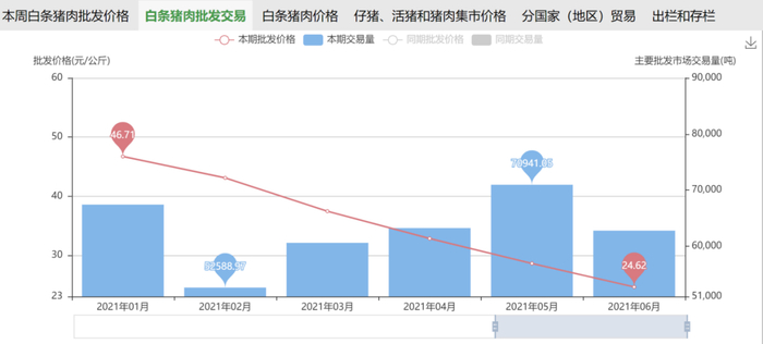 2021年上半年,我国猪价步入下行区间。农业农村部重点农产品市场信息平台6月28日数据显示,2021年1月-6月,白条猪肉批发交易价格由46.71元/公斤一路降至24.62元/公斤。同时,2021年第24周瘦肉型白条猪肉出厂价格环比下跌8.9%至18.83元/公斤,同比下跌58.1%。