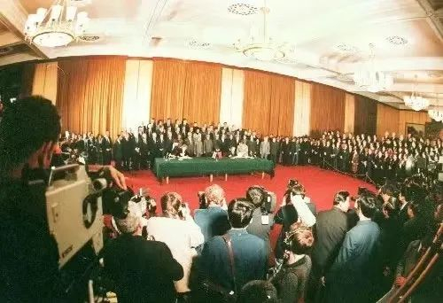 1984年12月19日下午5时30分,《中华人民共和国政府和大不列颠及北爱尔兰联合王国政府关于香港问题的联合声明》签字仪式在北京人民大会堂西大厅隆重举行。