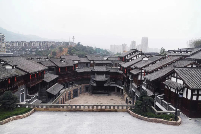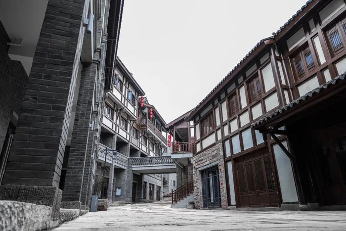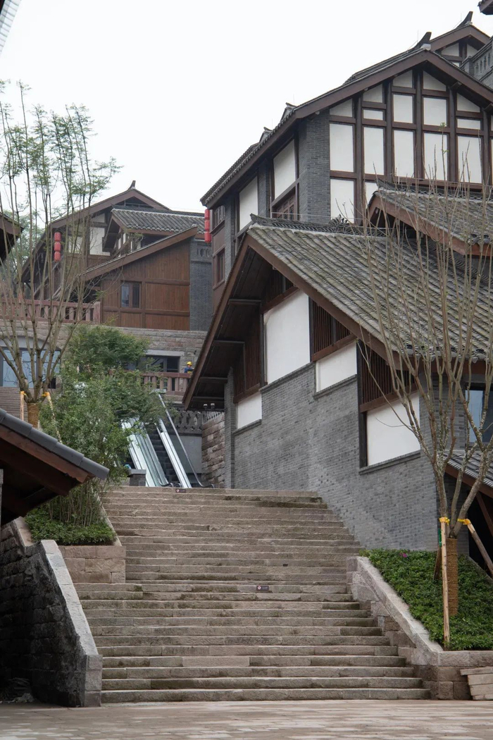 磁器口后街秉承了古镇“三山两溪汇一江”的山水格局,保留特色的堡坎、梯道、树木等环境景观要素,复原历史环境,打造了一系列台院、吊脚楼、小缆车、檐廊街等充满山城场镇风情的建筑空间。