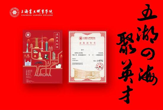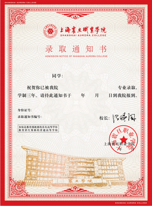 录取通知书由正本和封套两部分组成,风格稳重而不失青春明媚。封套使用标志性建筑互相融合,重构了一个新的校园场景,呈校园美好风貌,显特色教育底蕴。整体设计与旅专红主色调相结合,凸显喜庆热烈的气氛,录取通知书采用烫金工艺,以精湛的制作工艺使录取通知书显得更加珍贵和隆重,在细节中展示上海旅专对每一位新生的关怀和尊重。