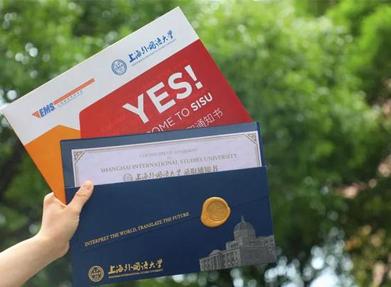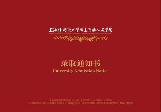 上海外国语大学本科录取通知书采用信封样式,寓意开启未来。封面上醒目的英文校训“诠释世界 成就未来”与加盖的金色火漆印章相得益彰,包含融通中外之意。