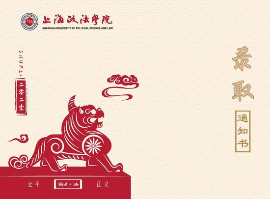 用象征着司法“公平公正”的神兽“獬豸(xiè zhì)”为元素,绘制出剪纸,创作出录取通知书封面,设计寓意每一个上政学子都应该有“支持公平与正义”的品质;同时,也突出上政以“法”为主干的办学特色。