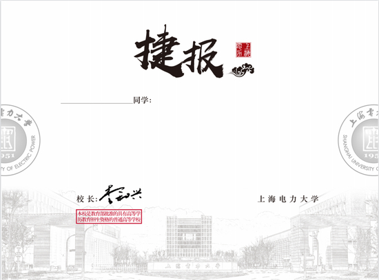 上海电力大学本科生录取通知书中金色和红色的碰撞,传递这喜悦与自豪;素雅清丽的色彩下,临港校区跃然纸上。捷报踏着祥云,好运乘着清风,祝愿上电的新生们鹏程万里!