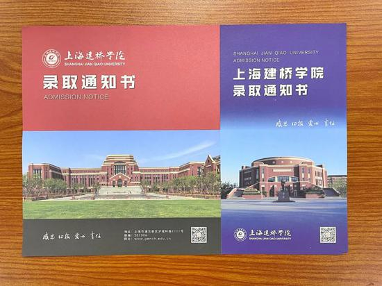 上海建桥学院录取通知书采用建桥红与建桥蓝为主色调,封面上使用了学校标志性建筑:汲取知识养料的图书馆与象征精神标杆的雷锋像。录取通知书左右两联可以分开,学生可保留副本用于永久珍藏。此外,录取通知书还采用了多项防伪技术,如纸张采用水印防伪,录取通知书的边框由学校字母构成等。