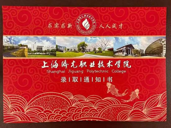 录取通知书整体以大红和两条烫金的鲤鱼为背景,意在鲤鱼跃龙门的美好寓意。上方印有学院标志性建筑风景:带有“济光绿”的学院logo,以及“求实求新,人人成才”的校训,象征着济光学子欣欣向荣,追逐梦想。