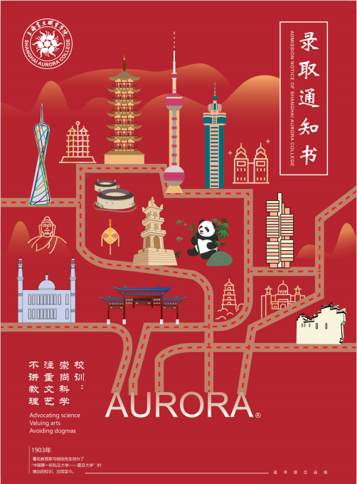 通知书整体以红色为基调,寓意学子学业红红火火,在校学习蒸蒸日上,我们将这份喜讯传达至学子手中。内页以古典的设计,将庄严的仪式感同震旦教学楼插画相结合,来传达震旦悠久的历史文化和创新的教学模式理念。