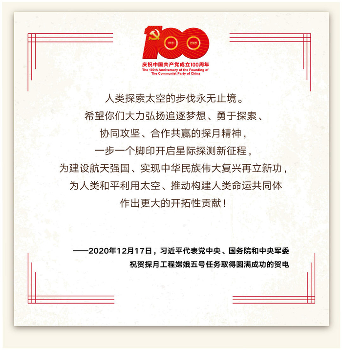 习近平总书记发来贺电,勉励探月工程任务指挥部并参加嫦娥五号任务的全体同志“大力弘扬追逐梦想、勇于探索、协同攻坚、合作共赢的探月精神,一步一个脚印开启星际探测新征程,为建设航天强国、实现中华民族伟大复兴再立新功,为人类和平利用太空、推动构建人类命运共同体作出更大的开拓性贡献”。