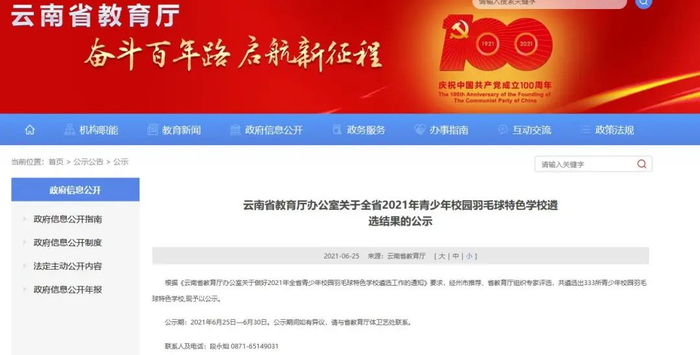 【公示】涉及333所学校!2021年云南省青少年校园羽毛球特色学校拟认定名单公示
