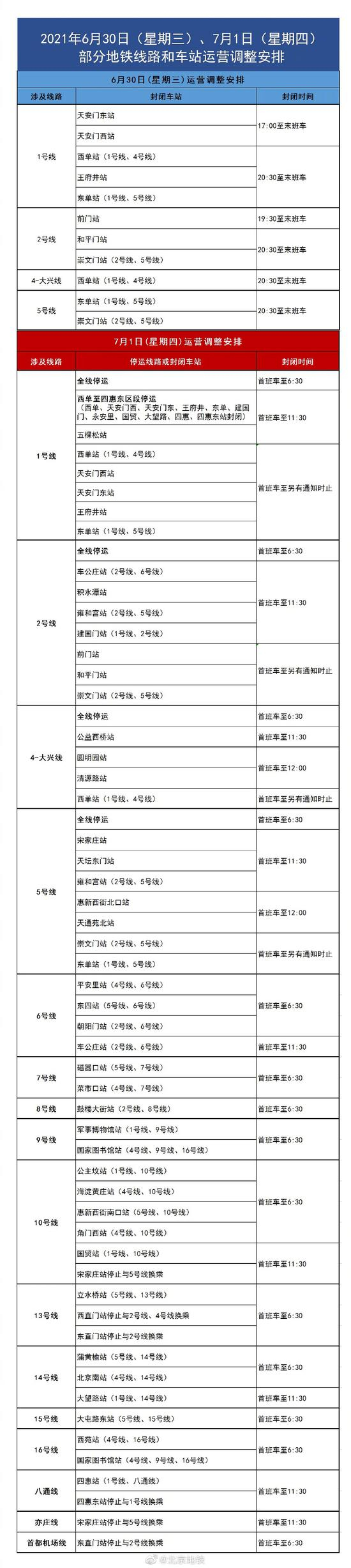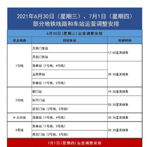 根据北京市公安局《关于庆祝中国共产党成立100周年大会期间采取交通管制的通告》,2021年6月30日(星期三)、7月1日(星期四)部分地铁线路和车站将进行如下运营调整: