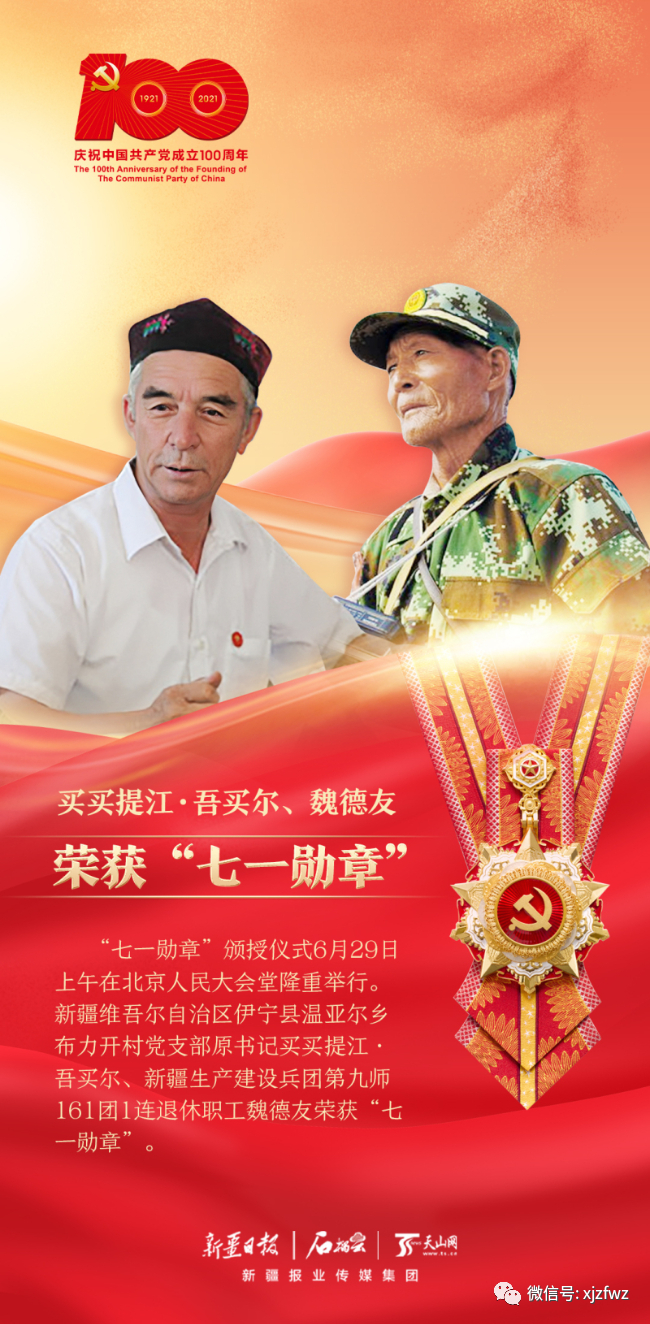 天山网-新疆日报快讯庆祝中国共产党成立100周年“七一勋章”颁授仪式6月29日上午在北京人民大会堂隆重举行。新疆维吾尔自治区伊宁县温亚尔乡布力开村党支部原书记买买提江·吾买尔、新疆生产建设兵团第九师161团1连退休职工魏德友荣获“七一勋章”。