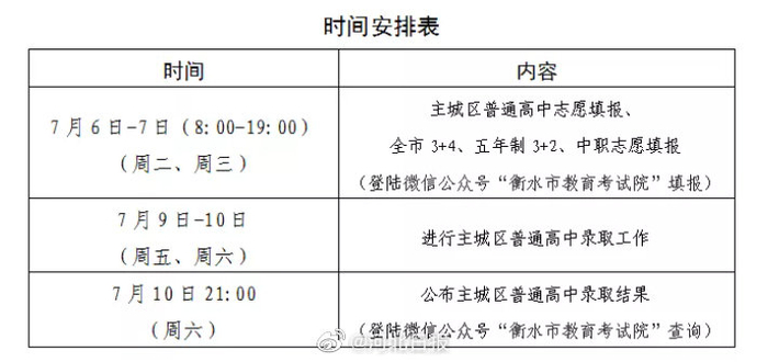 志愿填报时间安排:主城区(不含冀州区)中考考生普通高中(含衡水市职教中心对口升学)志愿填报及全市3+4、五年制(3+2)、普通中职学校志愿填报时间为7月6日至7日,广大考生和家长关注微信公众号“衡水市教育考试院”和衡水市教育考试院网站(http://t.cn/A6yjgVTb),及时了解相关信息。(衡水晚报)[编辑|王伟]