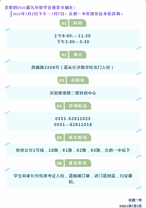 据合肥一中消息,合肥一中发布中考招生咨询公告,2021年7月2日下午—7月7日,合肥一中欢迎2021届九年级毕业班家长朋友来校咨询。