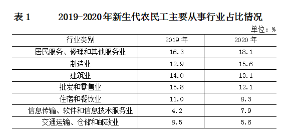 调查样本中,2020年就业人数前五位的行业与上年一致,依次为居民服务、修理和其他服务业,制造业,建筑业,批发和零售业,住宿和餐饮业,共吸纳67.2%的新生代农民工就业。