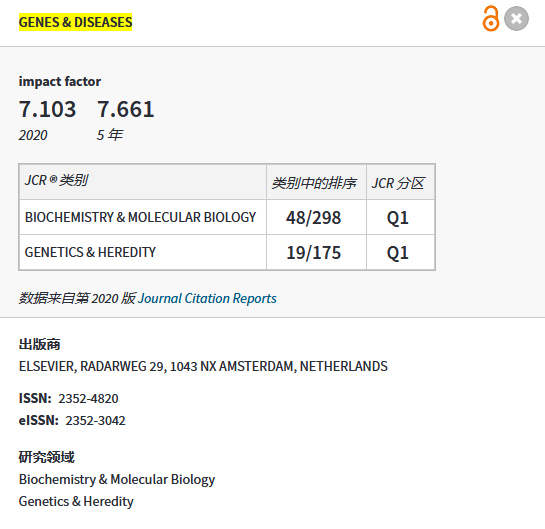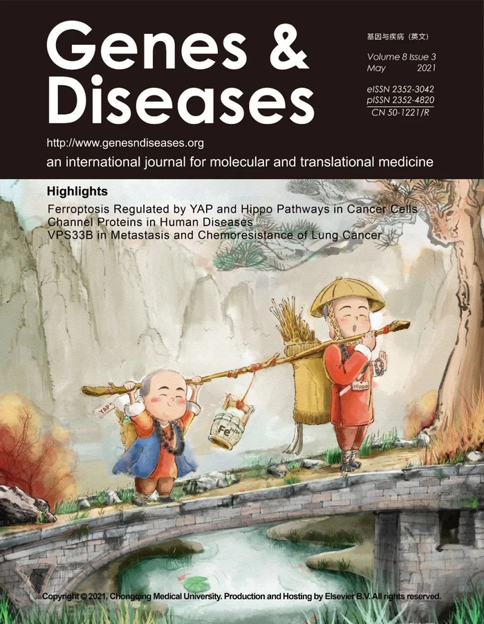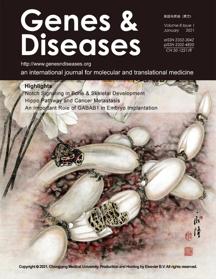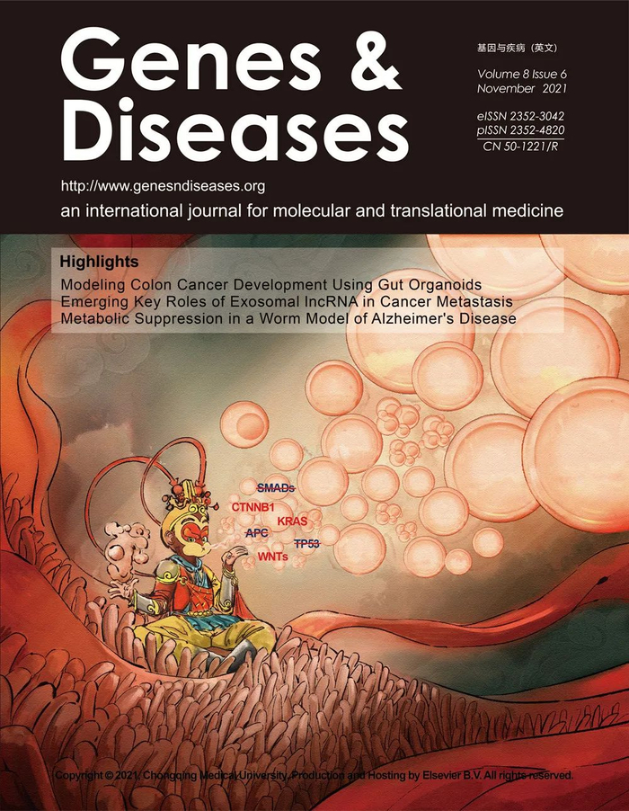 Genes & Diseases创办于2014年9月,采用严格的国际同行评议、完全开放获取(Open Access)办刊模式,国际合作出版方为Elsevier。主要侧重于报道有关人类疾病相关的分子机制和治疗方法的研究,涵盖分子生物学、细胞生物学、药理学、生物信息学、再生医学、基因治疗、重大疾病早期诊断等多学科的前沿交叉研究领域。