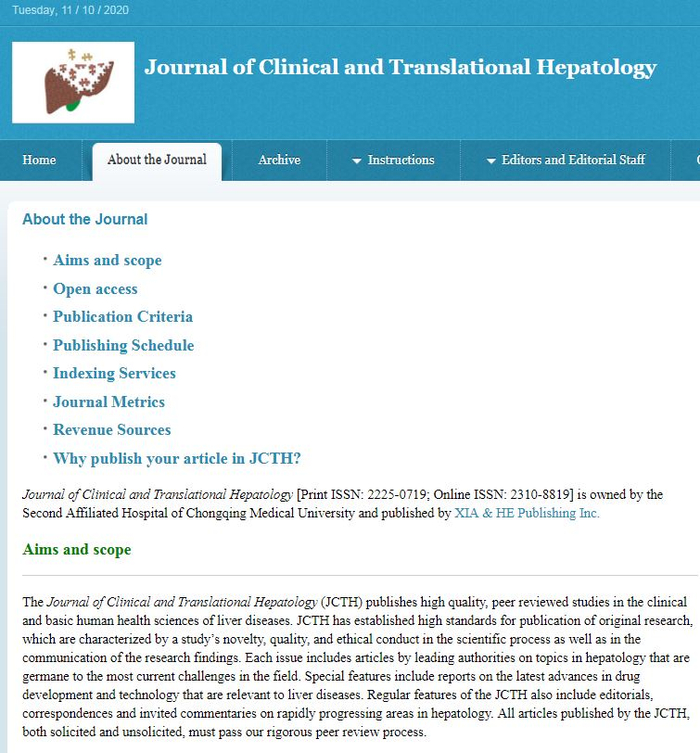 Journal of Clinical and Translational Hepatology(以下简称JCTH)由重庆医科大学附属第二医院创办,委托华誉出版社出版的肝病研究期刊,由重庆医科大学附属第二医院任红教授任总编,夏华向教授、George Y. Wu教授共同任主编。JCTH杂志启动创刊至今已10年,主要收录肝病领域基础、临床或转化相关的研究等文章。