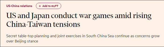 英媒报道援引六名知情人士的话称,从特朗普政府执政的最后一年开始,美日就一直在为可能发生的台海冲突做军事准备,包括最高机密的兵棋推演,以及在南海和东海举行联合军事训练。