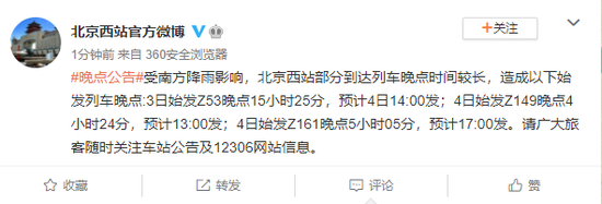 受南方降雨影响,北京西站部分到达列车晚点时间较长,造成以下始发列车晚点:3日始发Z53晚点15小时25分,预计4日14:00发;4日始发Z149晚点4小时24分,预计13:00发;4日始发Z161晚点5小时05分,预计17:00发。请广大旅客随时关注车站公告及12306网站信息。