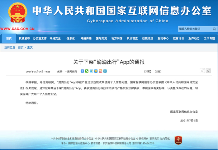 国家互联网信息办公室依据《中华人民共和国网络安全法》相关规定,通知应用商店下架“滴滴出行”App,要求滴滴出行科技有限公司严格按照法律要求,参照国家有关标准,认真整改存在的问题,切实保障广大用户个人信息安全。
