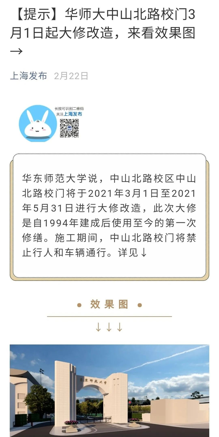 经过4个月的大门修缮和周边施工,7月2日,学校发布《关于中山北路3663号校门重启及金沙江路135号校门关闭的通知》,宣布华东师大中山北路3663号校门将于2021年7月5日6:00重新启用,开放时间为00:00~24:00。所有小型车辆、非机动车和行人由校门两侧进出校园。