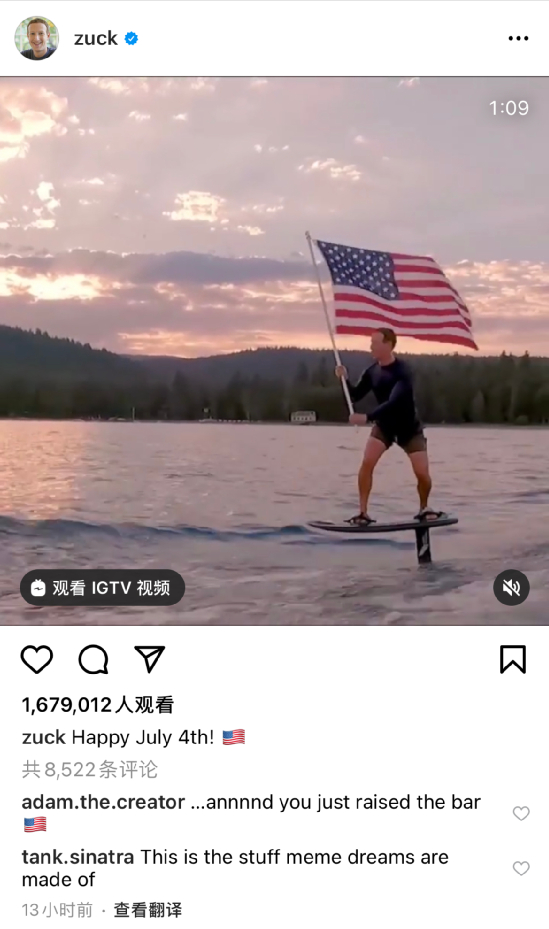 视频中,这名亿万富豪在日落时分,手举美国国旗,脚踏电动冲浪板,在水面上冲浪。扎克伯格将这段视频发在了Instagram平台上,几个小时内浏览量突破160万。
