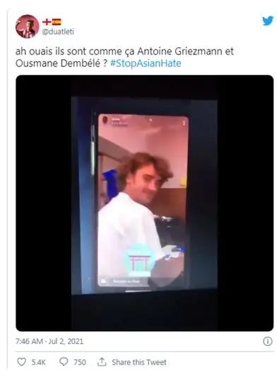 (2020 欧洲杯球星奥斯曼•登贝莱(右)在视频中与安托万•格列兹曼(左)嘲笑亚洲酒店员工而陷入种族主义风暴)