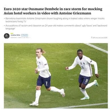 视频于上周五在社交媒体上流传后引发巨大争议。有媒体称,“社交媒体视频显示奥斯曼•登贝莱‘嘲笑亚洲技术人员’后,法国国家队卷入种族主义风暴。”