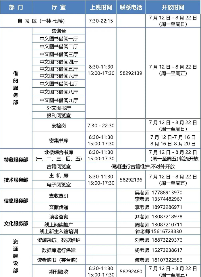 1. 暑假期间,各单位实行领导带班和轮休值班制度。各单位按规定妥善安排好假期值班、疫情防控、安全保卫等各项工作,遇有重大突发事件,应及时报告并妥善处置。(学校值班电话:58292188;保卫部(处)值班电话:58292110;网络与信息安全值班电话:58292675)。假期期间,教学、保卫等具体工作由相关职能部门另行通知。