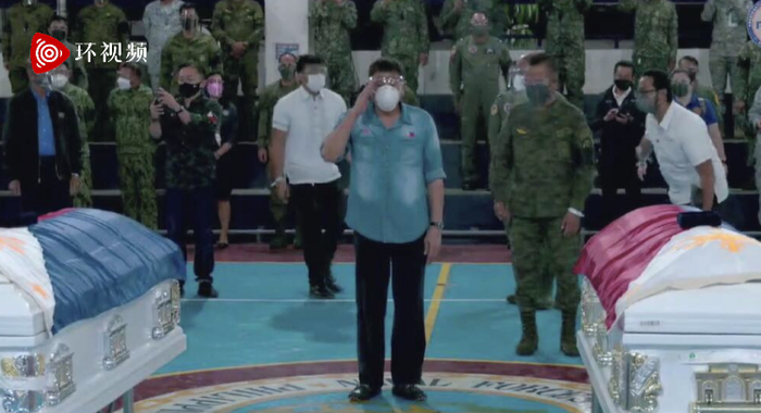 “我向你们表示慰问,我和你们一样感到悲伤。作为三军统帅,这些生命的逝去,我受到的伤害最大。”报道称,杜特尔特在海军基地向覆盖着菲律宾国旗的遇难者棺木敬礼后说道。