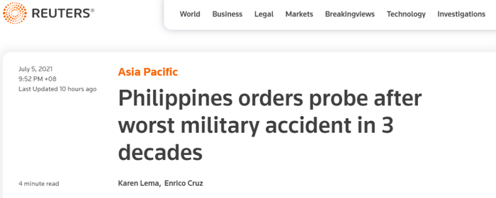 当地时间7月4日11时30分左右,菲律宾军方一架C-130运输机在苏禄省帕提库尔镇附近坠毁。菲律宾国防部长5日称,7月4日发生的菲律宾军机坠毁事故的死亡人数已上升到52人,其中包括3名平民,另有40多名士兵受伤。
