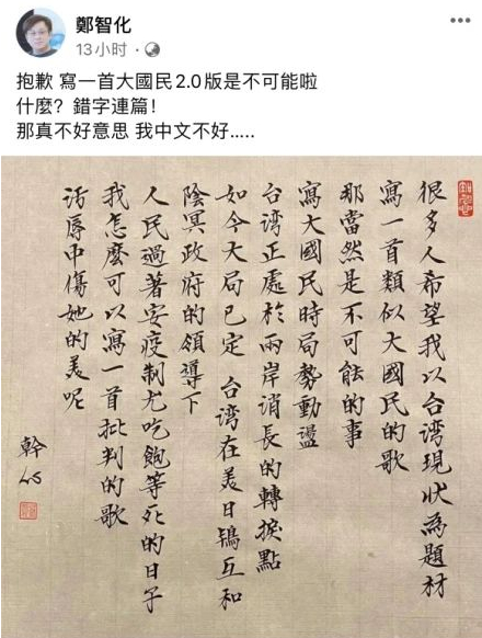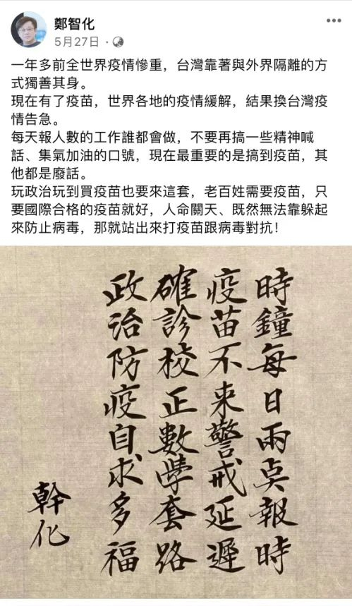 事情的起因是郑智化在脸书上发布了一张毛笔书法作品图片,抨击台湾疫情下一些民众被民进党当局的意识形态所蒙蔽,“不自觉地成为了冷血贪婪阴谋者最大的帮凶”。