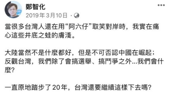 2019年,面对大陆的快速发展,一些台湾人却闭目塞听,还在用“阿六仔”取笑大陆人,郑智化在脸书直言“实在痛心这些井底之蛙的肤浅”。两岸对比之下,他不禁诘问,“一直原地踏步了20年,台湾还要继续这样下去吗?”