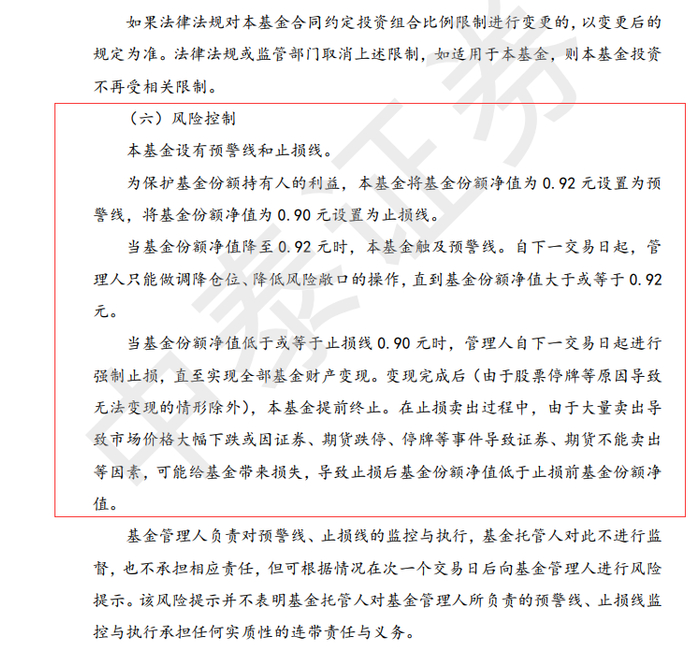 合同还显示,当基金份额净值低于或等于止损线0.90元时,管理人自下一交易日起进行强制止损,直至实现全部基金财产变现。变现完成后,基金提前终止。