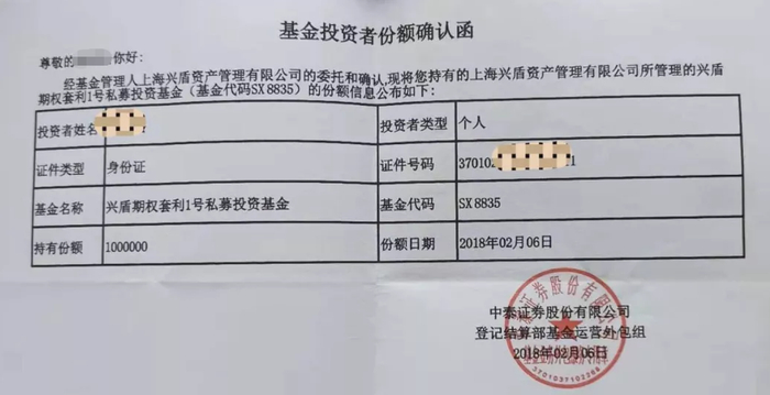近日,证券时报·券商中国记者获悉,一位山东投资者2018年1月斥资100万购买上海兴盾资产管理有限公司(简称“兴盾资产”)发行的私募基金产品——兴盾期权套利1号,基金托管方为中泰证券。