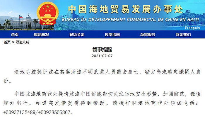 中国海地贸易发展办事处网站7日发布领事提醒称,海地总统莫伊兹在其寓所遭不明武装人员袭击身亡,警方尚未确定嫌疑人身份。