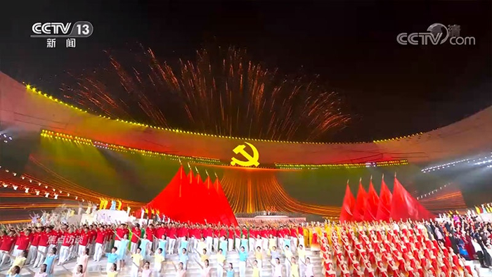 当高达16米的金色党徽庄严升起,在焰火盛放中光芒四射,全场气氛在这一刻达到高潮。《没有共产党就没有新中国》的歌声响起时,声浪冲天,全场沸腾。