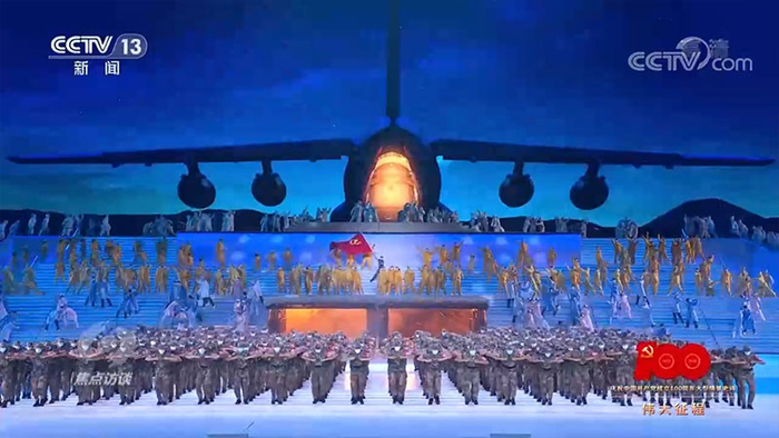 在第四篇章,以新冠肺炎疫情为背景的节目《人民至上》中,当大屏幕上的飞机缓缓打开舱门,舞台中央两扇大门同时打开,解放军战士和医务工作者冲出的那一刻,真实发生的历史和舞台实现了完美结合,无论是现场还是电视机前的观众仿佛再次置身那个危急的时刻。