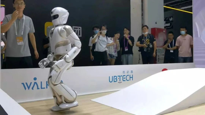 来自深圳优必选科技有限公司全新一代仿人服务机器人X是这次展厅的“明星”,仿真人、像人一样交替双腿行走,可适应地形上坡、上楼梯,还能用双臂给人捶背和观众下象棋。据优必选科技Walker产品负责人谢铮介绍,Walker X集六大AI技术于一身,定位家庭服务机器人,可以完成端茶、倒水、递物、浇花、擦桌子等家庭服务,还能自主操控冰箱、吸尘器等家电。